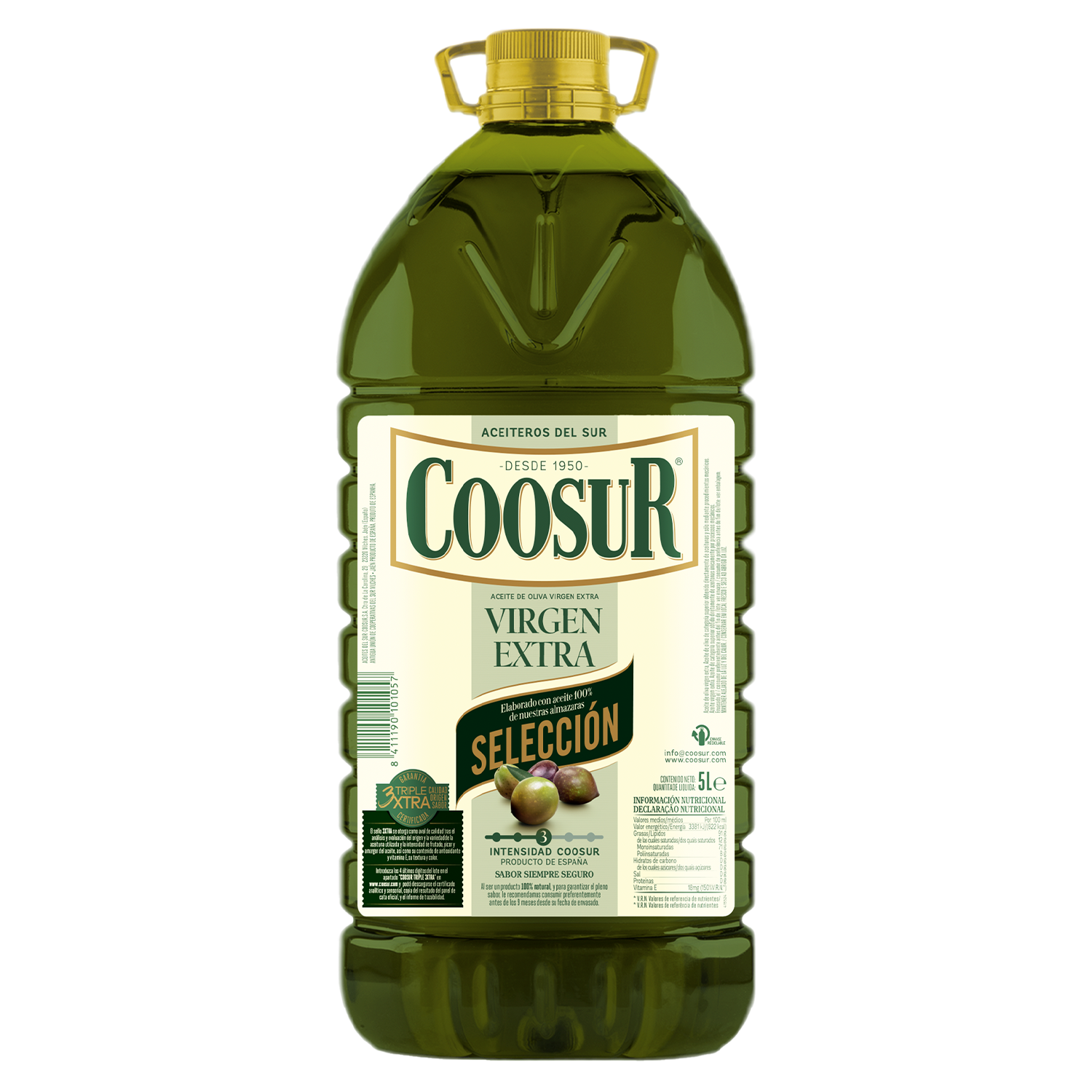 En Coosur nos preocupamos por tu máxima comodidad y queremos que te olvides de cargar con más peso de la cuenta en tus compras en el supermercado. Además, comprando nuestro aceite de oliva virgen extra en garrafa 5 litros estás adquiriendo aceite de oliva de Jaén, cuna por excelencia del aceite de oliva en nuestro país.